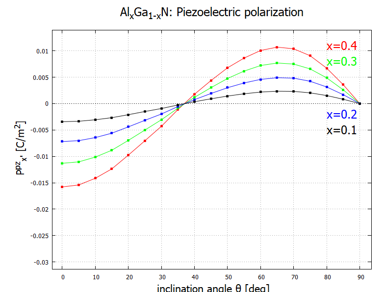 Similarly, piezoelectric polarization of AlxGa1-xN/GaN structure is calculated and shown in Figure 2.2.11. This result corresponds to Figure 8(a) in [Romanov2006]. The piezoelectric effect vanishes at around 38 degree in this case as well. Again, the zero point is different compared to [Romanov2006] as he misses the factor of 2 for the strain tensor component. As can be seen in Figure 2.2.9 shown above, this mistake is not relevant for 0 and 90 degrees.