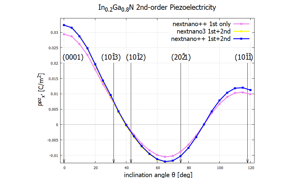 Figure 2.2.12 Second-order piezoelectricity. The second-order term enhances the piezoelectric polarization. The nextnano³ result (yellow) is consistent to the nextnano++ result (blue). Interface planes are indicated at corresponding angles.