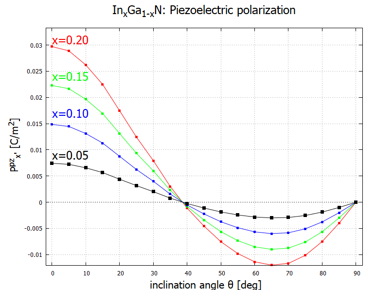 From the results in Figure 2.2.9 we can see that the piezoelectric polarization vanishes at an intermediate angle around 38 degree and that it is maximized when the inclination angle is zero.