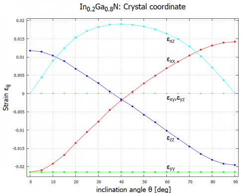 Figure 2.2.8 Elastic strain tensor components as a function of c-axis inclination angle \(\theta\) in crystal coordinate system.