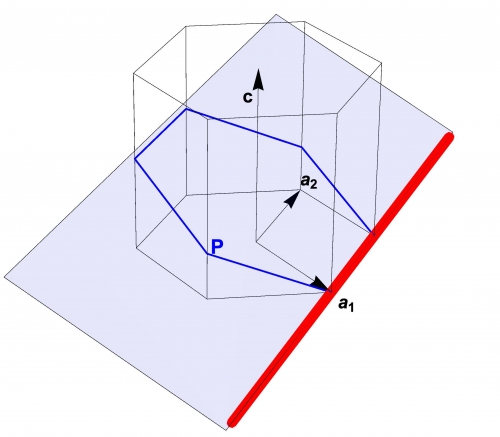 Figure 2.2.6 Cross-section of the wurtzite lattice. The dashed blue line indicates the x’-direction, which is normal to the interface (solid blue line).