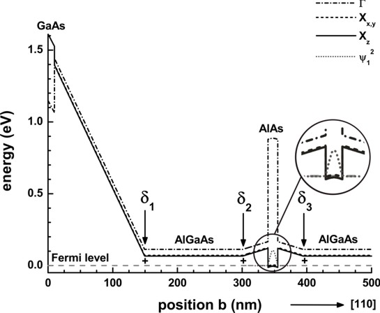 This band structure has been obtained by solving self-consistently the Schrödinger and the Poisson equation.