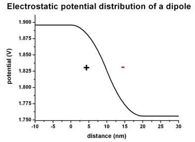 The following figures shows the corresponding electric field distribution (left) and the electrostatic potential (right).